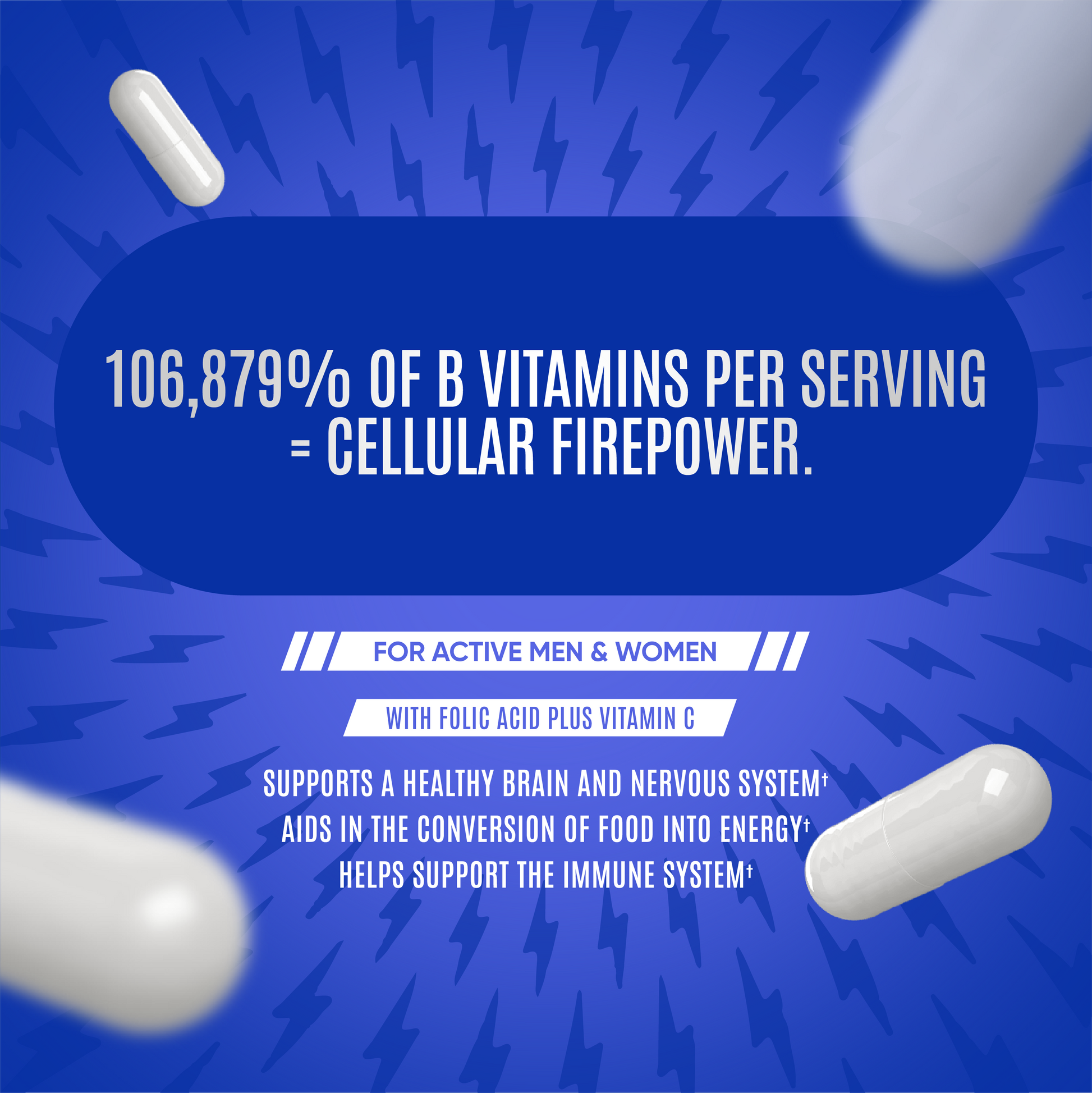 COMPLETE B-FORMULA Fill your body with energy daily. B-Vitamins aid in the conversion of food into energy, support a healthy brain and nervous system, and help support your immune system.