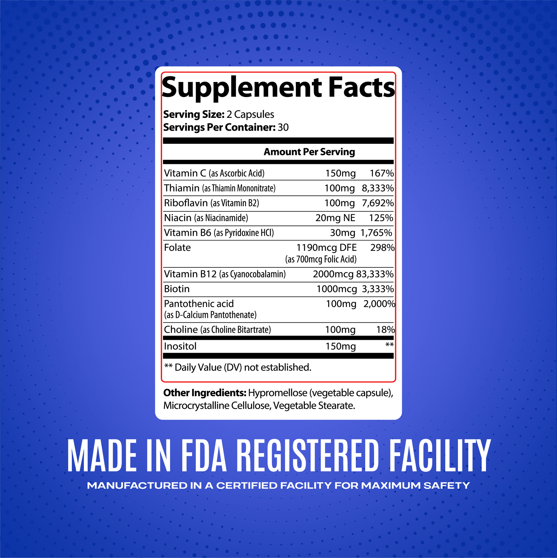 INGREDIENTS A serving Size of 2 Capsules contain Vitamin C (as Ascorbic Acid) 150 mg, Thiamine (as Thiamine Mononitrate)(Vitamin B1) 100 mg, Riboflavin (as Vitamin B2) 100 mg, Niacin (as Niacinamide)(Vitamin B3) 20 mg NE, Vitamin B6 (as Pyridoxine HCL) 30 mg, Folate (as 700 mcg Folic Acid) 1190 mcg DFE, Vitamin B12 (as Cyanocobalamin) 2000 mcg, Biotin 1000 mcg, Pantothenic Acid (as D-Calcium Pantothenate)(Vitamin B5) 100 mg, Choline (as Choline Bitartrate) 100 mg, and Inositol 150 mg. Other Ingredients: Cellulose (Vegetable Capsule), Microcrystalline Cellulose, Vegetable Stearate.