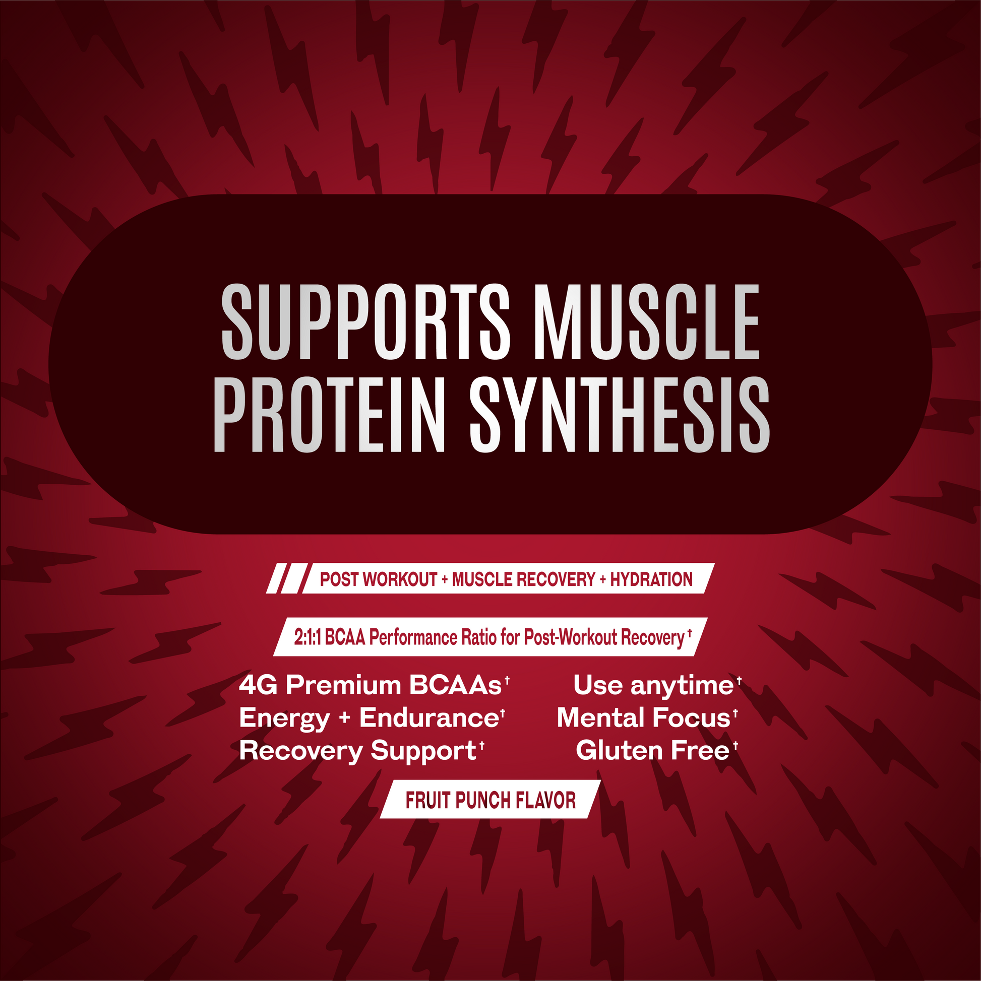 POST-WORKOUT RECOVERY Formulated with a clinically supported 2:1:1 ratio of BCAAs (L-Leucine, L-Isoleucine, and L-Valine), helps repair and rebuild muscle tissue after exercise, reducing muscle breakdown and supporting lean muscle gains. Designed for highly physically active men and women.