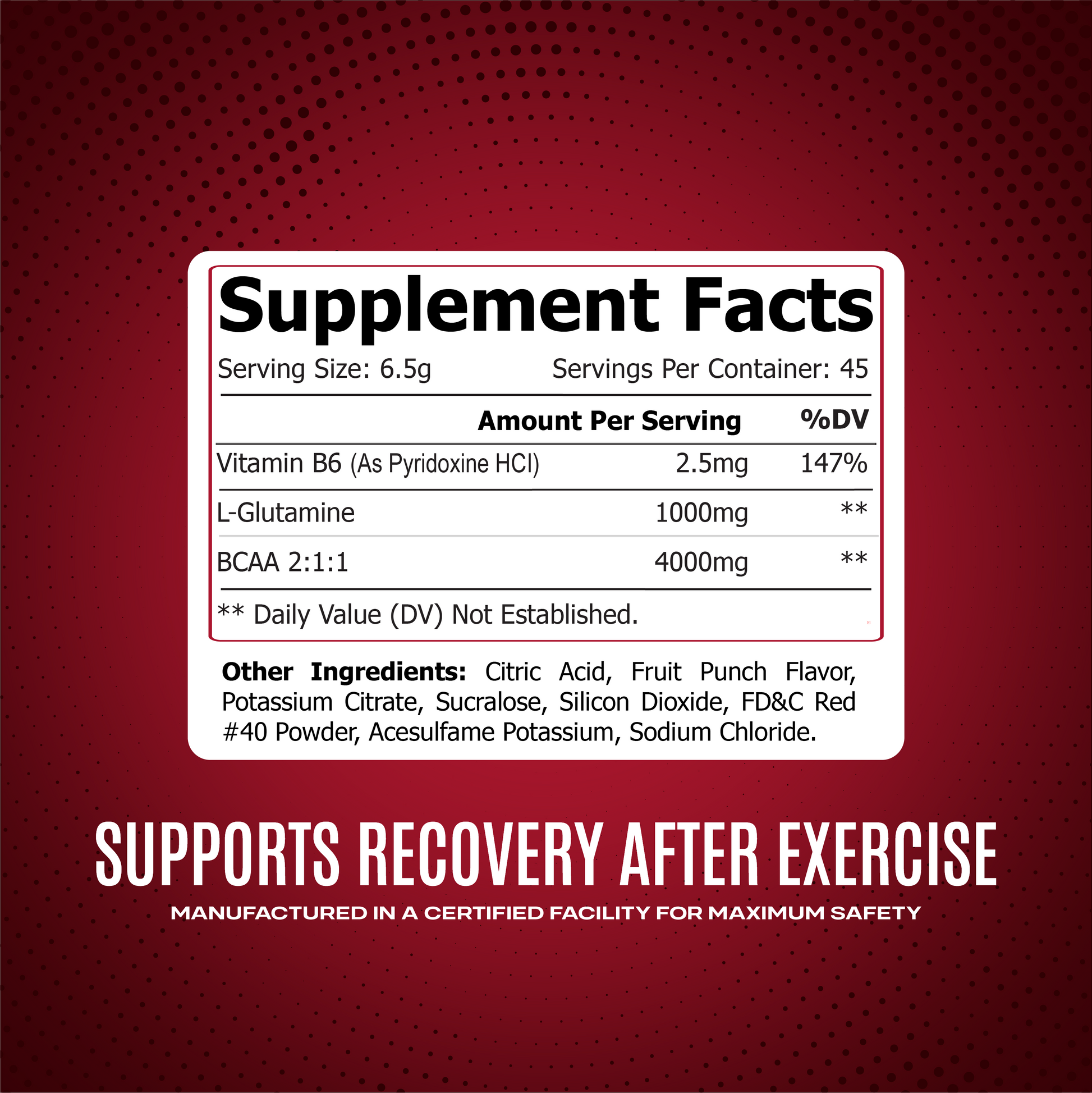 INGREDIENTS One serving contains Vitamin B6 (As Pyridoxine HCI) 2.5mg 147% L-Glutamine 1000mg, BCAA 2:1:1 4000 mg. Other Ingredients: Citric Acid, Fruit Punch Flavor, Potassium Citrate, Sucralose, Silicon Dioxide, FD&C Red #40 Powder, Acesulfame Potassium, Sodium Chloride.