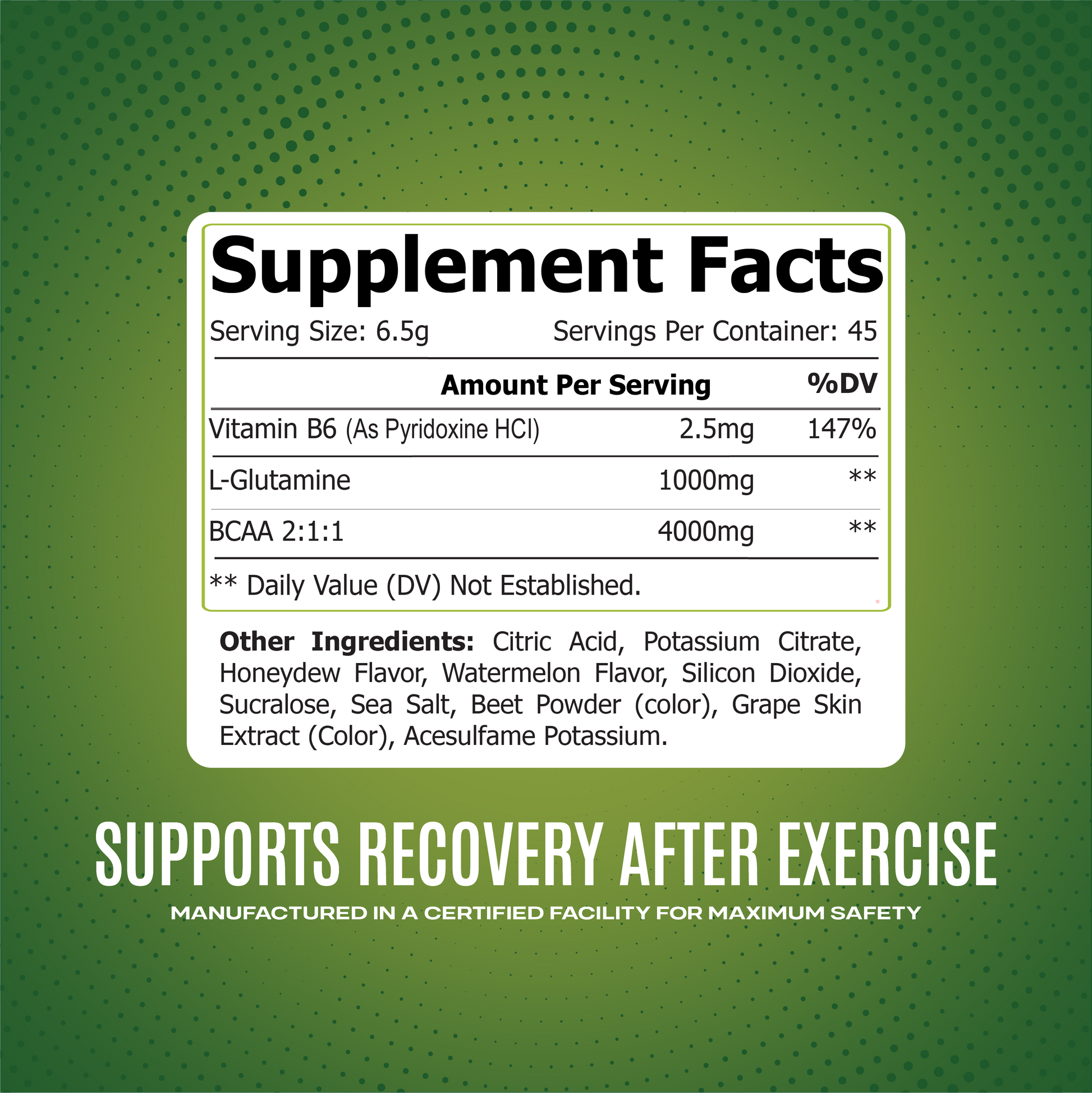 INGREDIENTS One serving contains Vitamin B6 (As Pyridoxine HCI) 2.5mg 147% L-Glutamine 1000mg, BCAA 2:1:1 4000 mg. Other Ingredients: Citric Acid, Potassium Citrate, Honeydew Flavor, Watermelon Flavor, Silicon Dioxide, Sucralose, Sea Salt, Beet Powder (color), Grape Skin Extract (Color), Acesulfame Potassium.