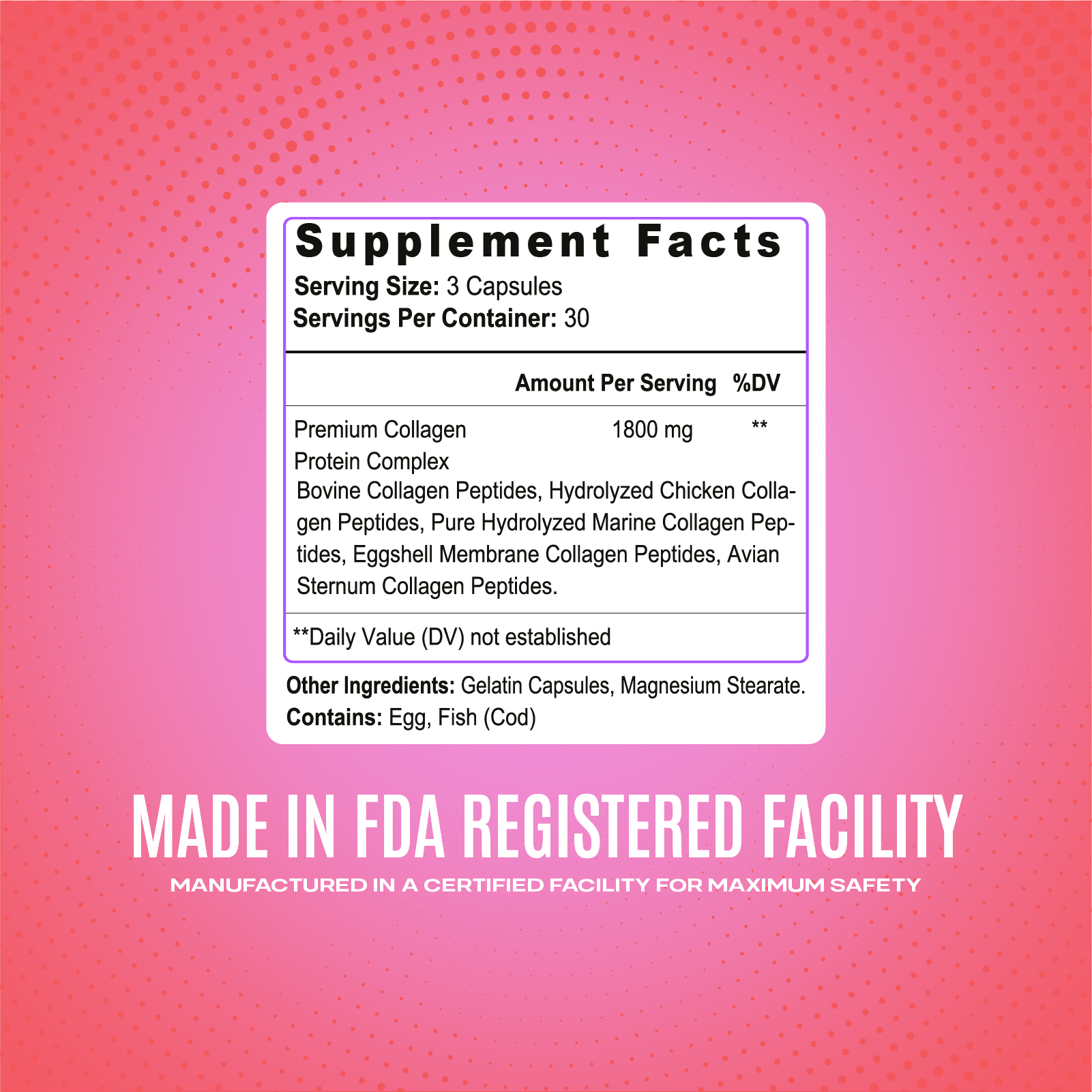 Peptides, Eggshell Membrane Collagen Peptides, Avian Sternum Collagen Peptides. Other Ingredients: Gelatin Capsules, Magnesium Stearate. Contains: Egg, Fish (Cod).