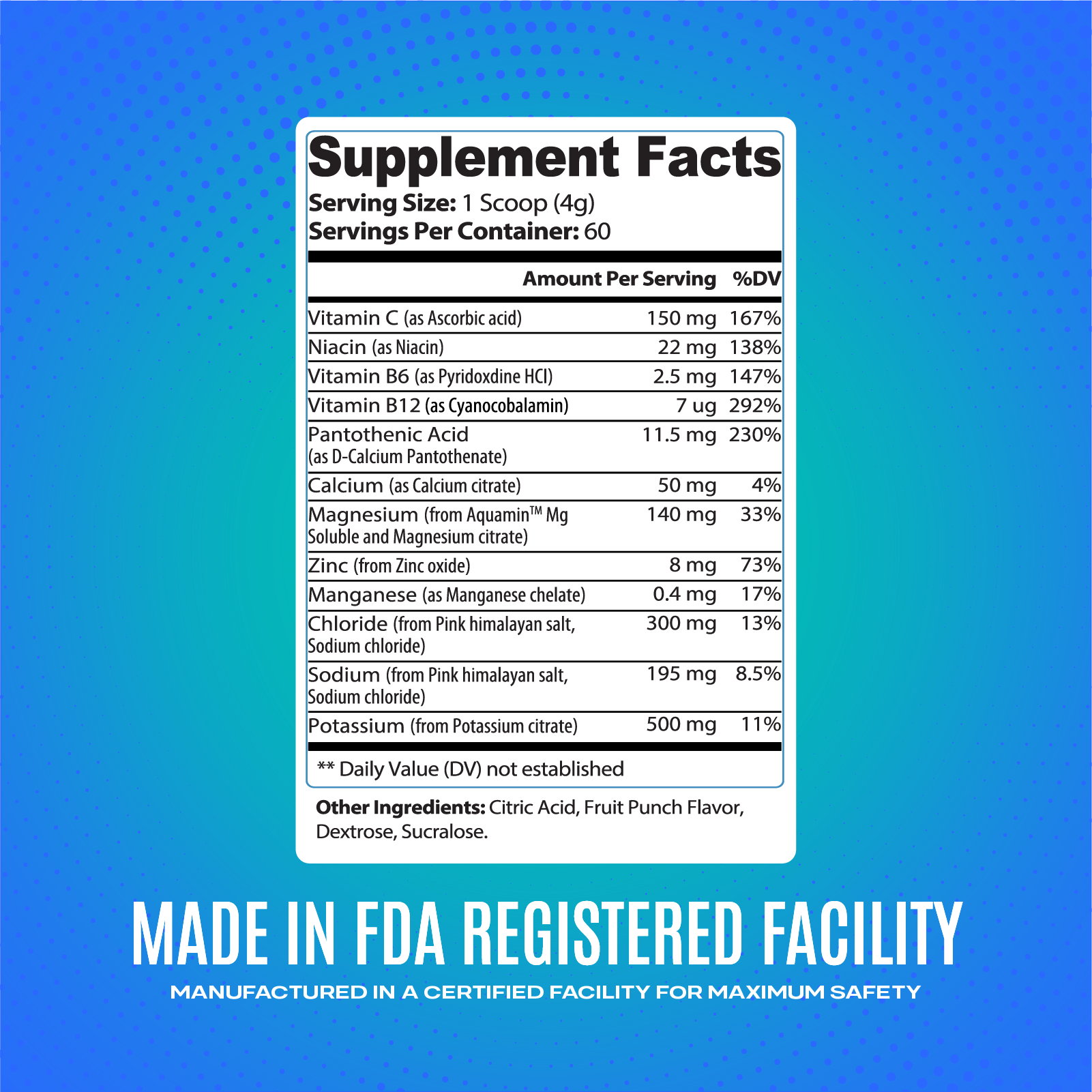 INGREDIENTS One serving contains Vitamin C (as Ascorbic acid) 150 mg 167%, Niacin (as Niacin) 22 mg 138%, Vitamin B6 (as Pyridoxdine HCI) 2.5 mg 147%, Vitamin B12 (as Cyanocobalamin) 7 ug 292%, Pantothenic Acid (as D-Calcium Pantothenate) 11.5 mg 230%, Calcium (as Calcium citrate) 50 mg 4%, Magnesium (from Aquamin TM Mg Soluble and Magnesium citrate) 140 mg 33%, Zinc (from Zinc oxide) 8 mg 73%, Manganese (as Manganese chelate) 0.4 mg 17%, Chloride (from Pink himalayan salt Sodium chloride) 300 mg 13%, Sodium (from Pink himalayan salt Sodium chloride) 195 mg 8.5%, Potassium (from Potassium citrate) 500 mg 11%. Other Ingredients: Citric Acid, Fruit Punch Flavor, Dextrose, Sucralose.