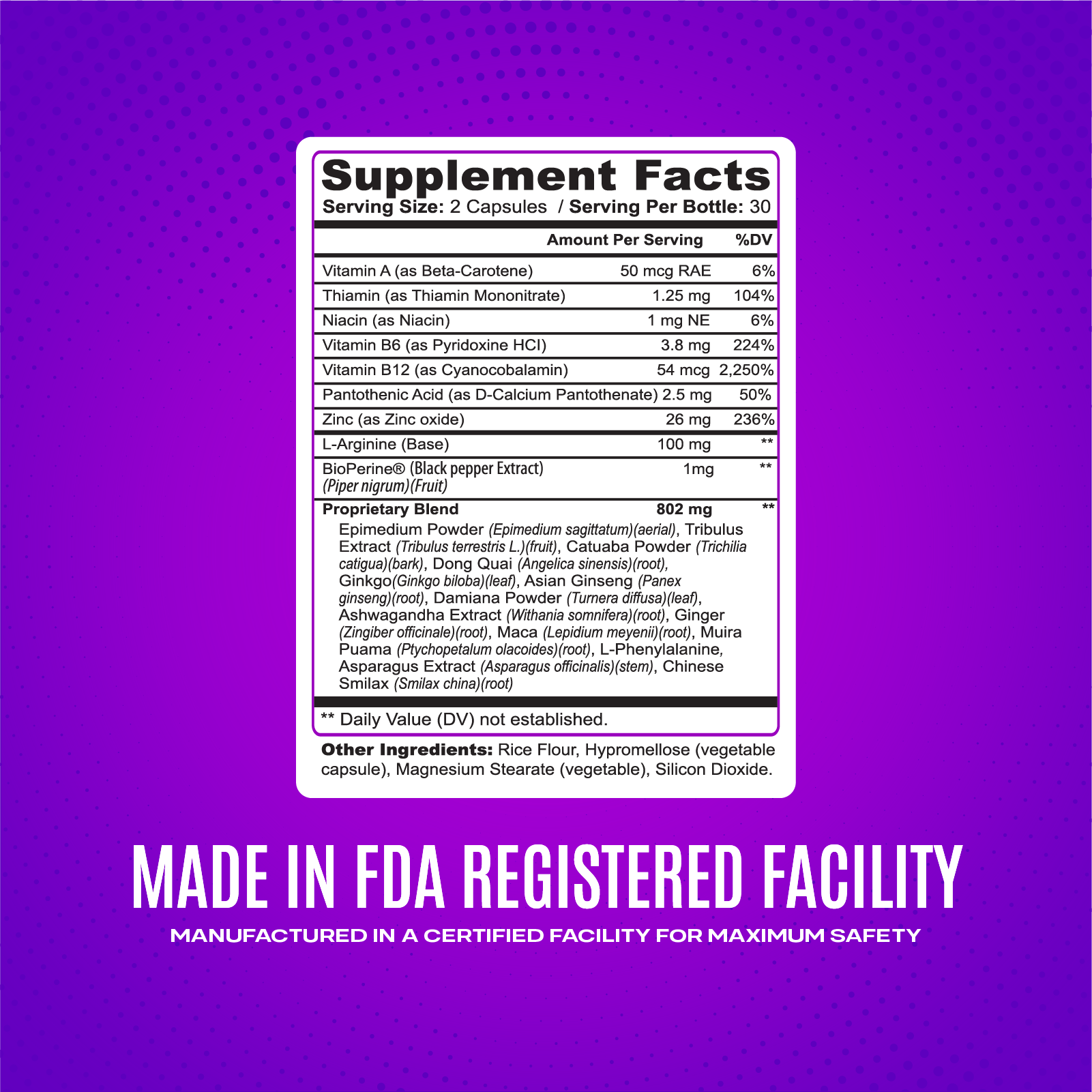 INGREDIENTS One serving contains vitamin A (as Beta-Carotene) 50 mcg RAE 6%, Thiamin (as Thiamin Mononitrate) 1.25 mg 104%, Niacin (as Niacin) 1 mg NE 6%, Vitamin B6 (as Pyridoxine HCI) 3.8 mg 224%, Vitamin B12 (as Cyanocobalamin) 54 mcg 2,250%, Pantothenic Acid (as D-Calcium Pantothenate) 2.5 mg 50%, Zinc (as Zinc oxide) 26 mg 236%, L-Arginine (Base) 100 mg, BioPerineÆ (Black pepper Extract) (Piper nigrum)(Fruit) 1mg. Proprietary Blend 802 mg: Epimedium Powder (Epimedium sagittatum)(aerial), Tribulus Extract (Tribulus terrestris L.)(fruit), Catuaba Powder (Trichilia catigua)(bark), Dong Quai (Angelica sinensis)(root), Ginkgo(Ginkgo biloba)(leaf), Asian Ginseng (Panex ginseng)(root), Damiana Powder (Turnera diffusa)(leaf), Ashwagandha Extract (Withania somnifera)(root), Ginger (Zingiber officinale)(root), Maca (Lepidium meyenii)(root), Muira Puama (Ptychopetalum olacoides)(root), L-Phenylalanine, Asparagus Extract (Asparagus officinalis)(stem), Chinese Smilax (Smilax china)(root).