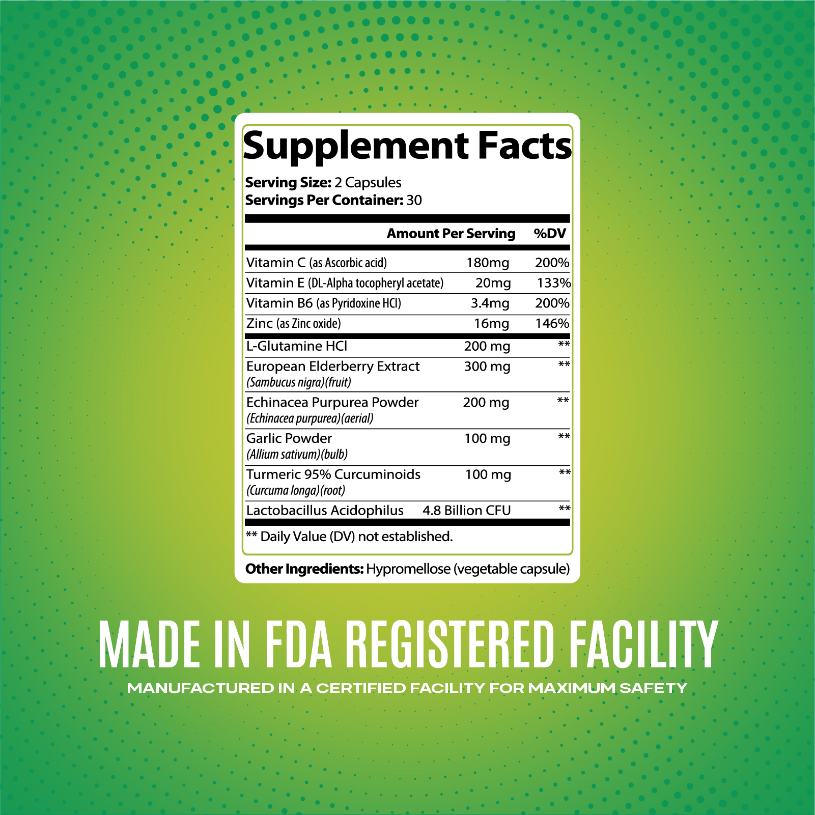INGREDIENTS Vitamin C (as Ascorbic Acid) 180 mg, Vitamin E (DH-Alpha Tocopherol Acetate) 20 mg, Vitamin B6 (as Pyridoxine HCL) 3.4 mg, Zinc (as Zinc Oxide) 16 mg, L-Glutamine HCL 200 mg, European Elderberry Fruit Extract (as Sambucus Nigra) 300 mg, Echinacea Powder (as Echinacea Purpurea) (Aerial) 200 mg, Garlic Powder (Allium Sativum) (Bulb) 100 mg, Turmeric 95% Curcuminoids (Curcuma Longa) (Root) 100 mg, and Lactobacillus Acidophilus 4.8 Billion CFU. Inactive Ingredients: Cellulose (Vegetable Capsule).