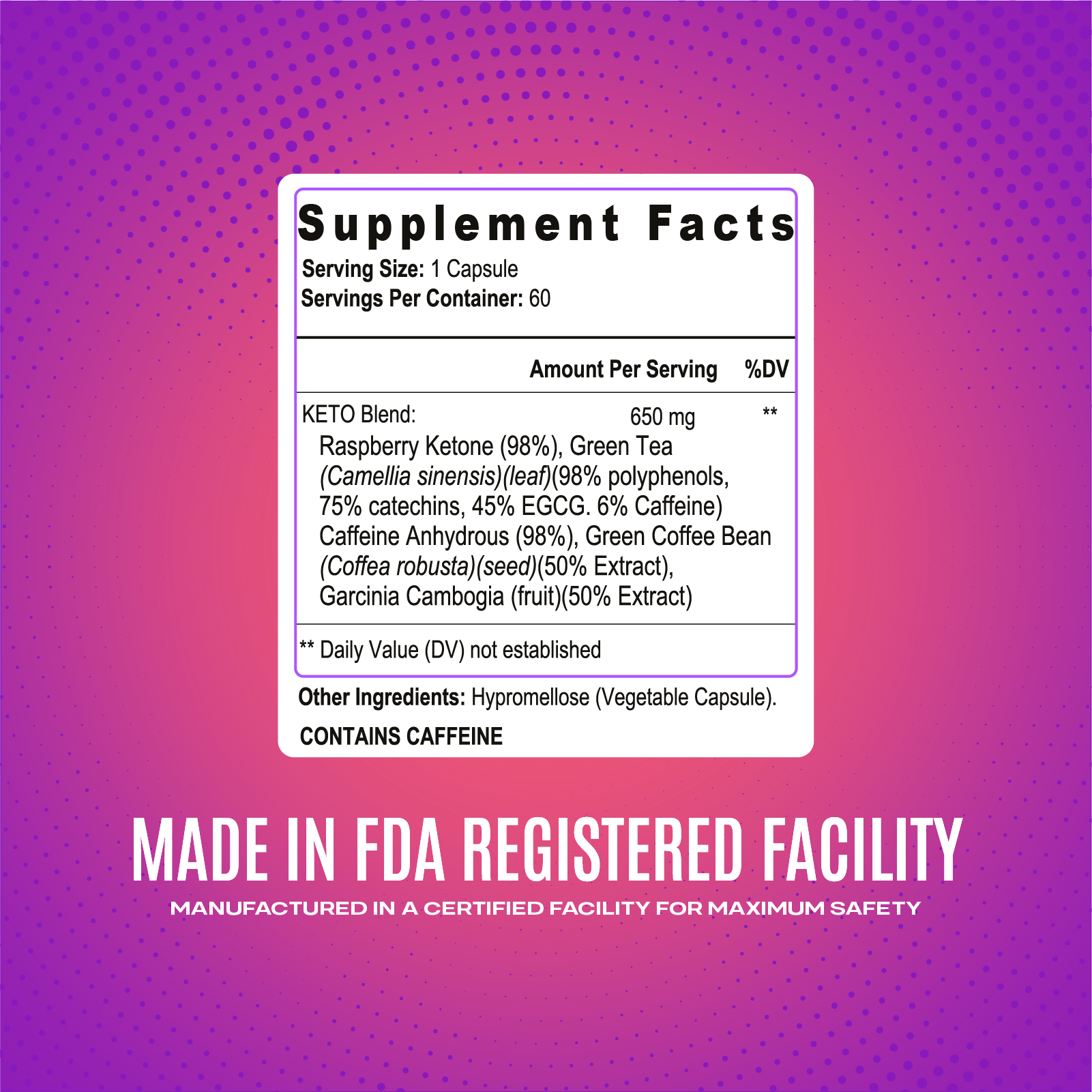 DESCRIPTION KETO 5 IN 1 helps aid the body increase the breakdown of lipids contained within the body’s fat cells. Our blend uses 3 of the most popular ingredients of raspberry ketones, green coffee bean and Garcinia Cambogia to help your body burn fat and not the carbohydrates in your body. Produced in easy to swallow capsules this vitamin supplement also adds a good source of fiber and vitamins for overall health.