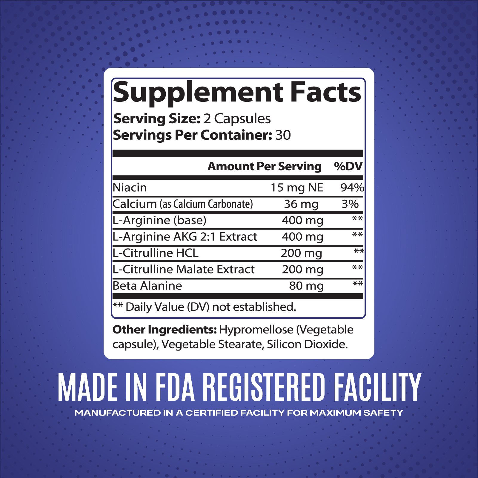 INGREDIENTS One serving contains Niacin 15 mg NE 94%, Calcium (as Calcium Carbonate) 36 mg 3%, L-Arginine (base) 400 mg, L-Arginine AKG 2:1 Extract 400 mg, L-Citrulline HCL 200 mg, L-Citrulline Malate Extract 200 mg, Beta Alanine 80 mg. Other Ingredients: Hypromellose (Vegetable capsule), Vegetable Stearate, Silicon Dioxide.