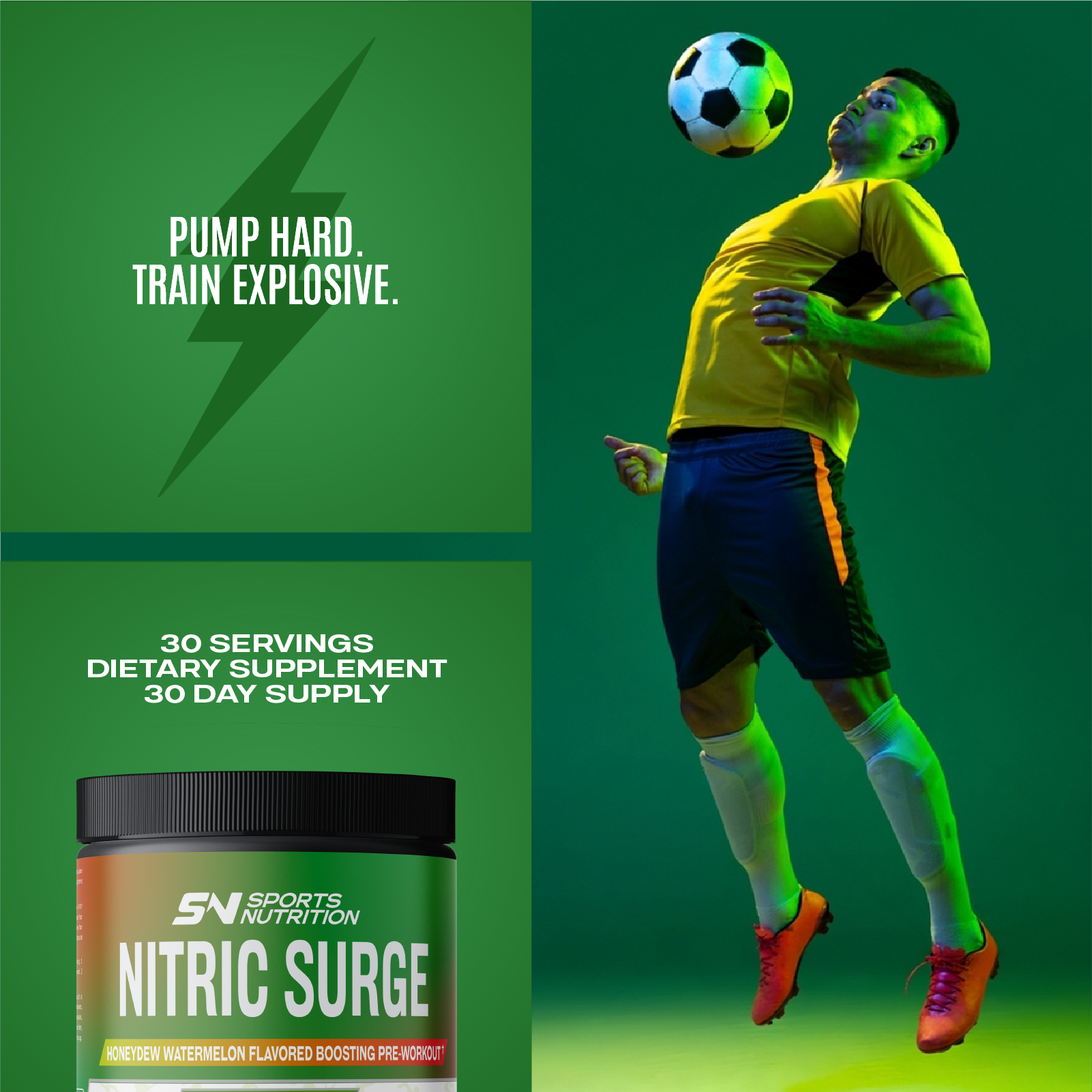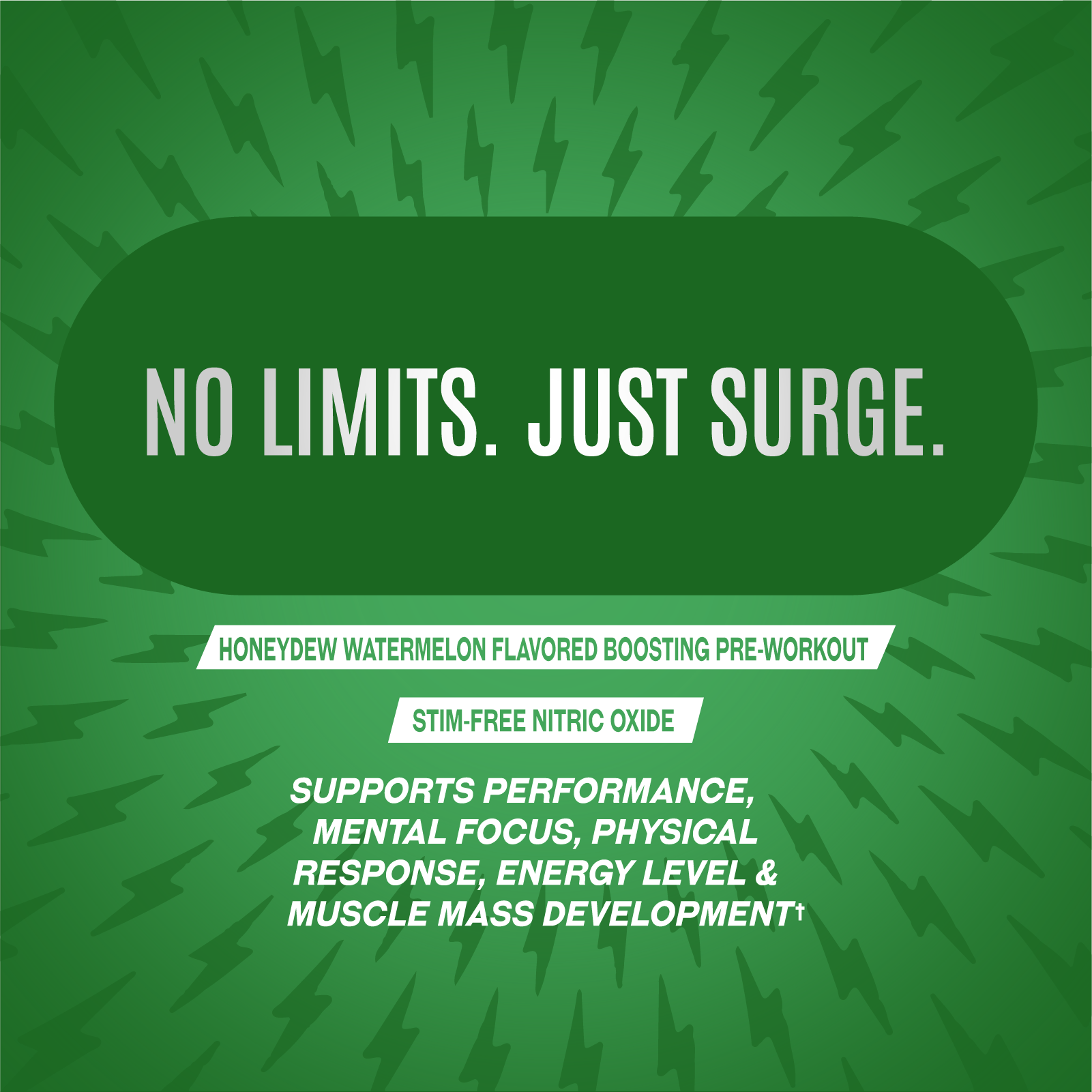 DESCRIPTION Our honeydew watermelon flavored SPORTS NUTRITION NITRIC SURGE PRE-WORKOUT promotes energy, increases focus and helps maintain endurance. Promotes muscle mass development. It will not cause sleep disturbances when taken close to the end of the day. Easy to dissolve powder.