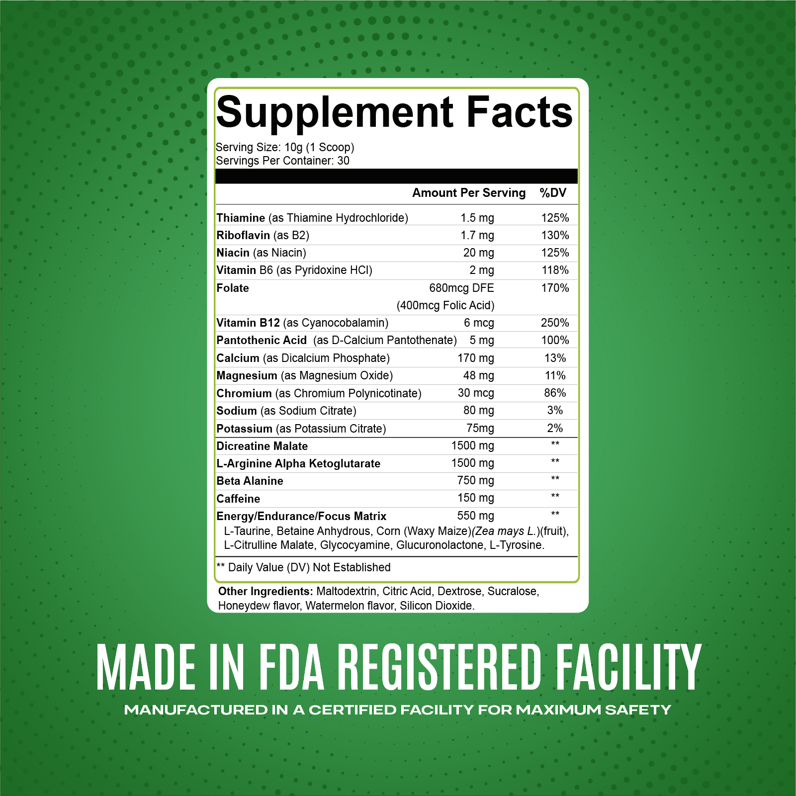 INGREDIENTS One serving contains Thiamine (as Thiamine Hydrochloride) 1.5 mg 125%, Riboflavin (as B2) 1.7 mg 130%, Niacin (as Niacin) 20 mg 25%, Vitamin B6 (as Pyridoxine HCl) 2 mg 118%, Folate (400mcg Folic Acid) 680mcg DFE 170%, Vitamin B12 (as Cyanocobalamin) 6 mcg 250%, Pantothenic Acid (as D-Calcium Pantothenate) 5 mg 100%, Calcium (as Dicalcium Phosphate) 170 mg 13%, Magnesium (as Magnesium Oxide) 48 mg 11%, Chromium (as Chromium Nicotinate) 30 mcg 86%, Sodium (as Sodium Citrate) 80 mg 3%, Potassium (as Potassium Citrate) 75mg 2%, Dicreatine Malate 1500 mg, L-Arginine Alpha Ketoglutarate 1500 mg, Beta Alanine 750 mg, Caffeine 150 mg. Energy/Endurance/Focus Matrix 550 mg: L-Taurine, Betaine Anhydrous, Corn (Waxy Maize)(Zea mays L.)(fruit), L-Citrulline Malate, Glycocyamine, Glucuronolactone, L-Tyrosine. Other Ingredients: Maltodextrin, Citric Acid, Silica, Fruit Punch Flavor Dextrose, Sucralose, Silicon Dioxide