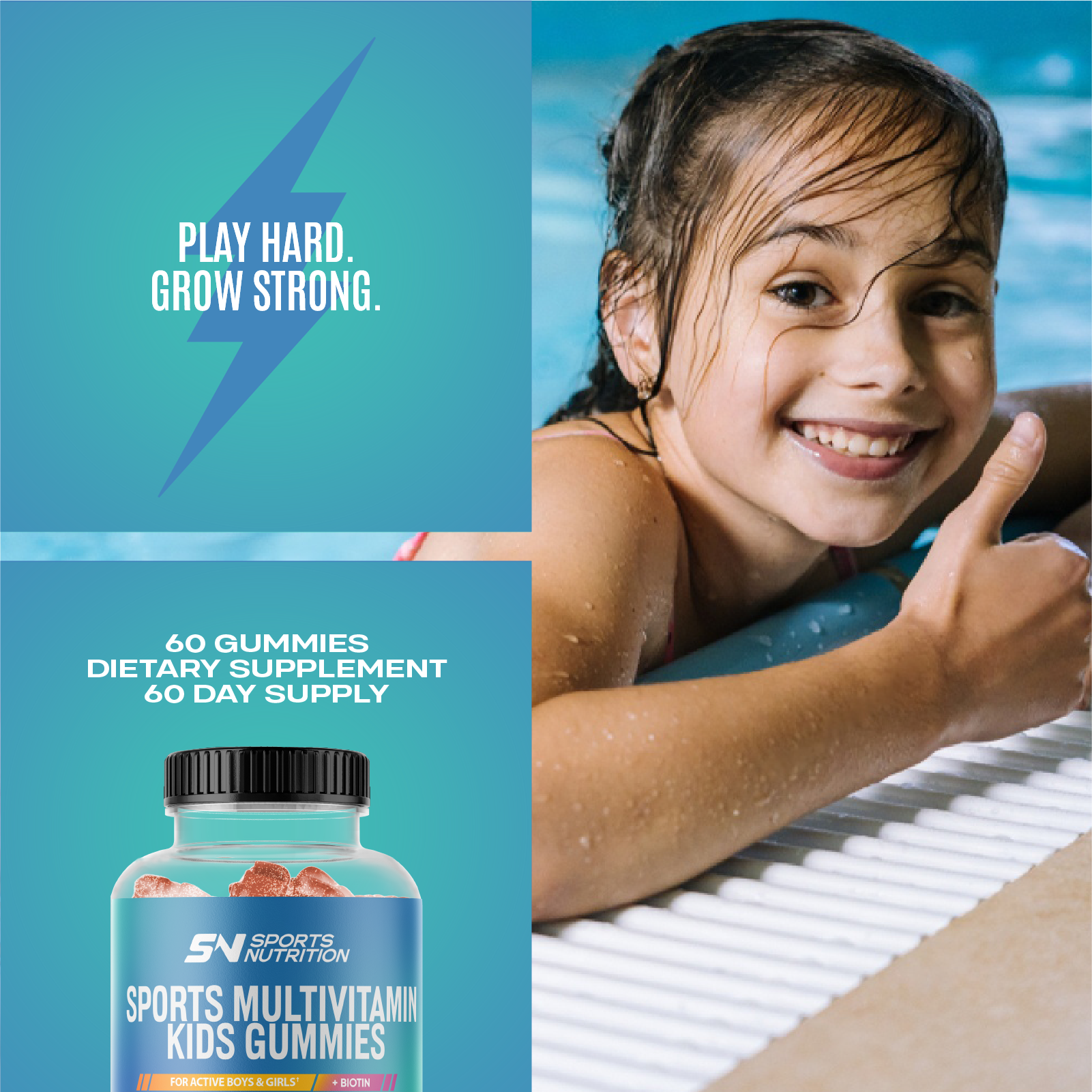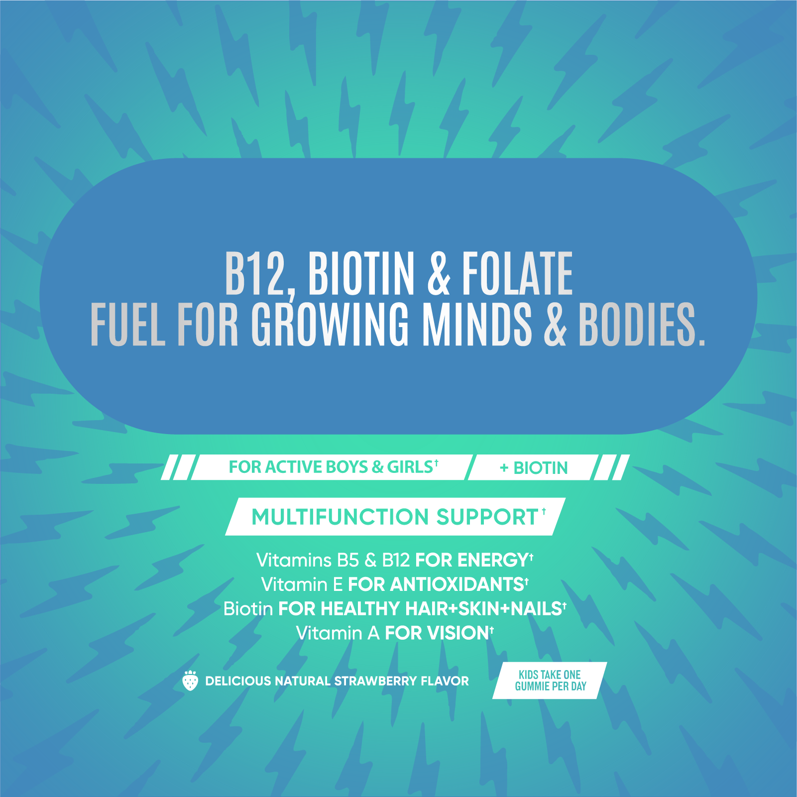 COMPLETE MULTIVITAMIN Maintaining healthy nutrition while playing your favorite sport or working out at the gym can be difficult. SPORTS NUTRITION Sports Multivitamin Kids Gummies packs 12 essential nutrients. B-Vitamins to support increase energy production and improve concentration levels, Vitamin E for antioxidant, and Vitamin A for vision. Our gummies have been added with Biotin to support beautiful and healthy hair, nails and skin.