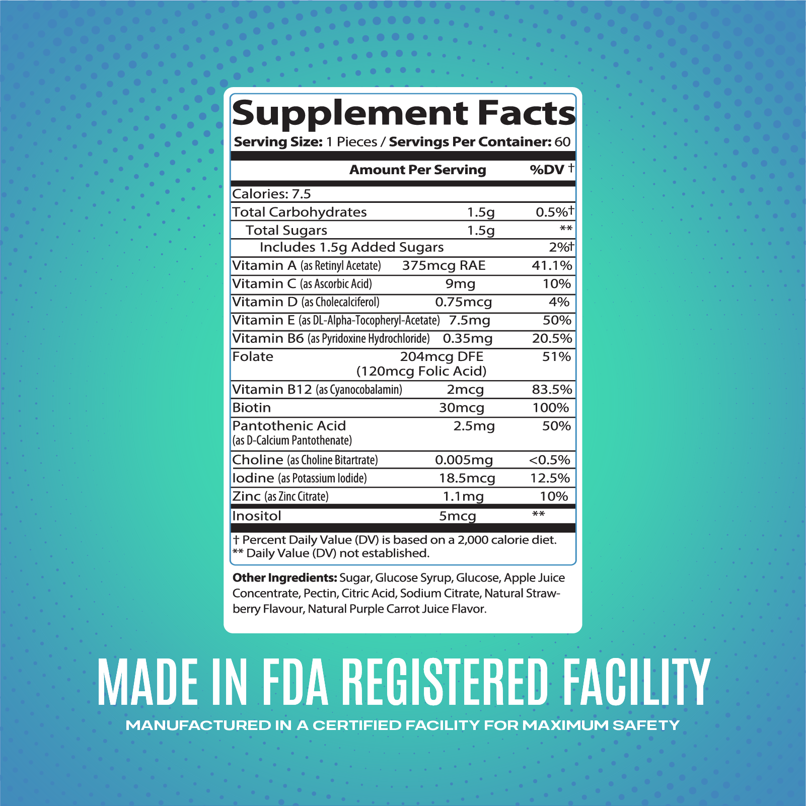 INGREDIENTS Vitamin A (as Retinyl Acetate) 375 mcg RAE 41.1%, Vitamin C (as Ascorbic Acid) 9 mg 10%, Vitamin D (as Cholecalciferol) 0.75 mcg 4%, Vitamin E (as DL-Alpha-Tocopheryl-Acetate) 7.5 mg 50 %, Vitamin B6 (as Pyridoxine Hydrochloride) 0.35 mg 20.5%, Folate 204 mcg DFE 51% (120 mcg Folic Acid), Vitamin B12 (as Cyanocobalamin) 2 mcg 83.5%, Biotin 30 mcg 100%, Pantothenic Acid 2.5 mg 50% (as D-Calcium Pantothenate), Choline (as Choline Bitartrate) 0.005 mg < 0.5%, Iodine (as Potassium Iodide) 18.5 mcg 12.5%, Zinc (as Zinc Citrate) 1.1 mg 10%, and Inositol 5 mcg. Total Carbohydrates 1.5 g 0.5%, Total Sugars 1.5 g, Includes 1.5 g Added Sugars 2%.