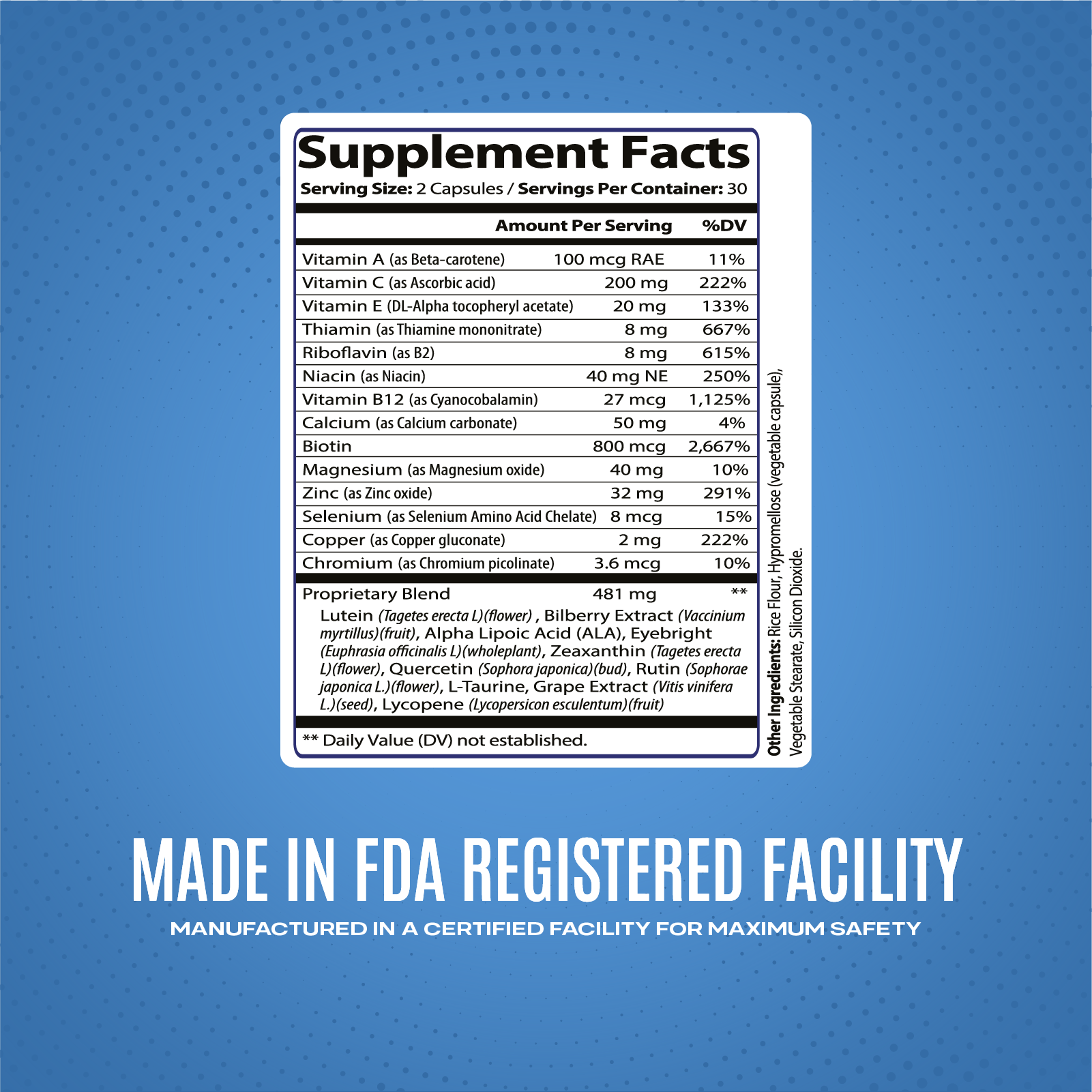 INGREDIENTS One serving contains Vitamin A (as Beta-carotene) 100mcg RAE 11%, Vitamin C (as Ascorbic acid) 200 mg 222%, Vitamin E (DL-Alpha tocopheryl acetate) 20 mg 133%, Thiamin (as Thiamine mononitrate) 8 mg 667%, Riboavin (as B2) 8 mg 615%, Niacin (as Niacin) 40 mg NE 250%, Vitamin B12 (as Cyanocobalamin) 27 mcg 1,125%, Calcium (as Calcium carbonate) 50 mg 4%, Biotin 800 mcg 2,667%, Magnesium (as Magnesium oxide) 40 mg 10%, Zinc (as Zinc oxide) 32 mg 291%, Selenium (as Selenium Amino Acid Chelate) 8 mcg 15%, Copper (as Copper gluconate) 2 mg 222%, Chromium (as Chromium picolinate) 3.6 mcg 10%. Proprietary Blend (481 mg) of Lutein (Tagetes erecta L)(ower) , Bilberry Extract (Vaccinium myrtillus)(fruit), Alpha Lipoic Acid (ALA), Eyebright (Euphrasia ocinalis L)(wholeplant), Zeaxanthin (Tagetes erecta L.)(ower), Quercetin (Sophora japonica)(bud), Rutin (Sophorae Japonica L.)(ower), L-Taurine, Grape Extract (Vitis vinifera L.)(seed), Lycopene (Lycopersicon esculentum)(fruit). Other Ingredients: Rice Flour, Hypromellose (vegetable capsule), Vegetable Stearate, Silicon Dioxide.