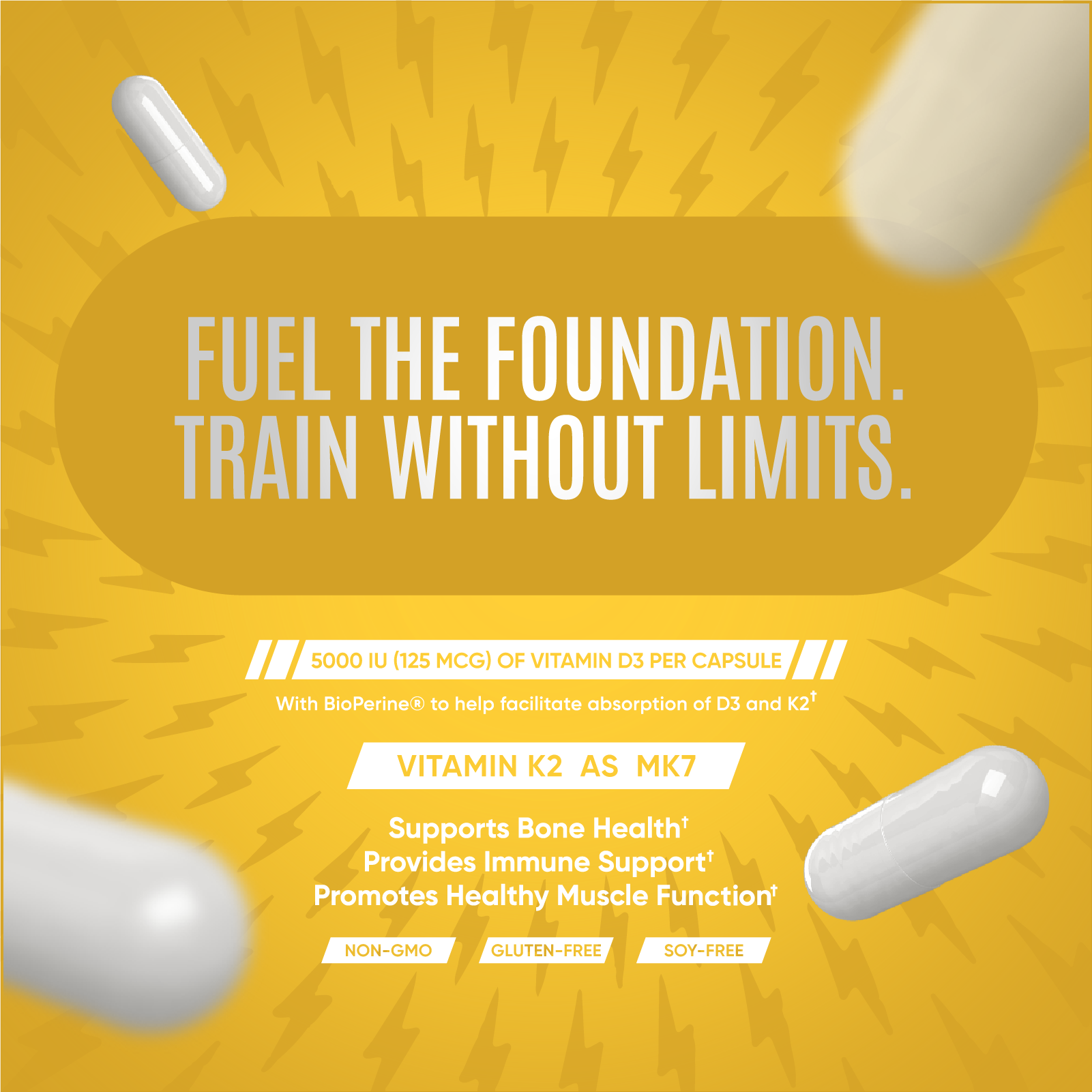 DESCRIPTION Sports Nutrition Vitamin D3 + K2 Capsules contain 5000 IU (125 mcg) of Vitamin D per serving (1 capsule), making it easy to add Vitamin D3 and K2 supplements to your daily routine. Vitamin D3 supports healthy bones, teeth, muscles and immune system. Vitamin K2 and D3 work together to form activating proteins that support healthy vascular function. Adding K2 to your vitamin D3 helps deliver calcium directly to your bones. Combining vitamin D3 and K2 is better for bone health than vitamin D3 alone. Sports Nutrition D3 + K2 is made in the USA in a GMP-Certified Facility with globally sourced ingredients and is Sugar-free, dairy-free, soy-free, vegetarian, and non-GMO, our ingredients are carefully chosen from the highest quality and are created to be both safe and effective. Designed for individuals with higher vitamin D needs and/or deficiencies. Adults take one D3 K2 capsule daily. Start your day with a Vitamin D3 and K2 supplement from Sports Nutrition.