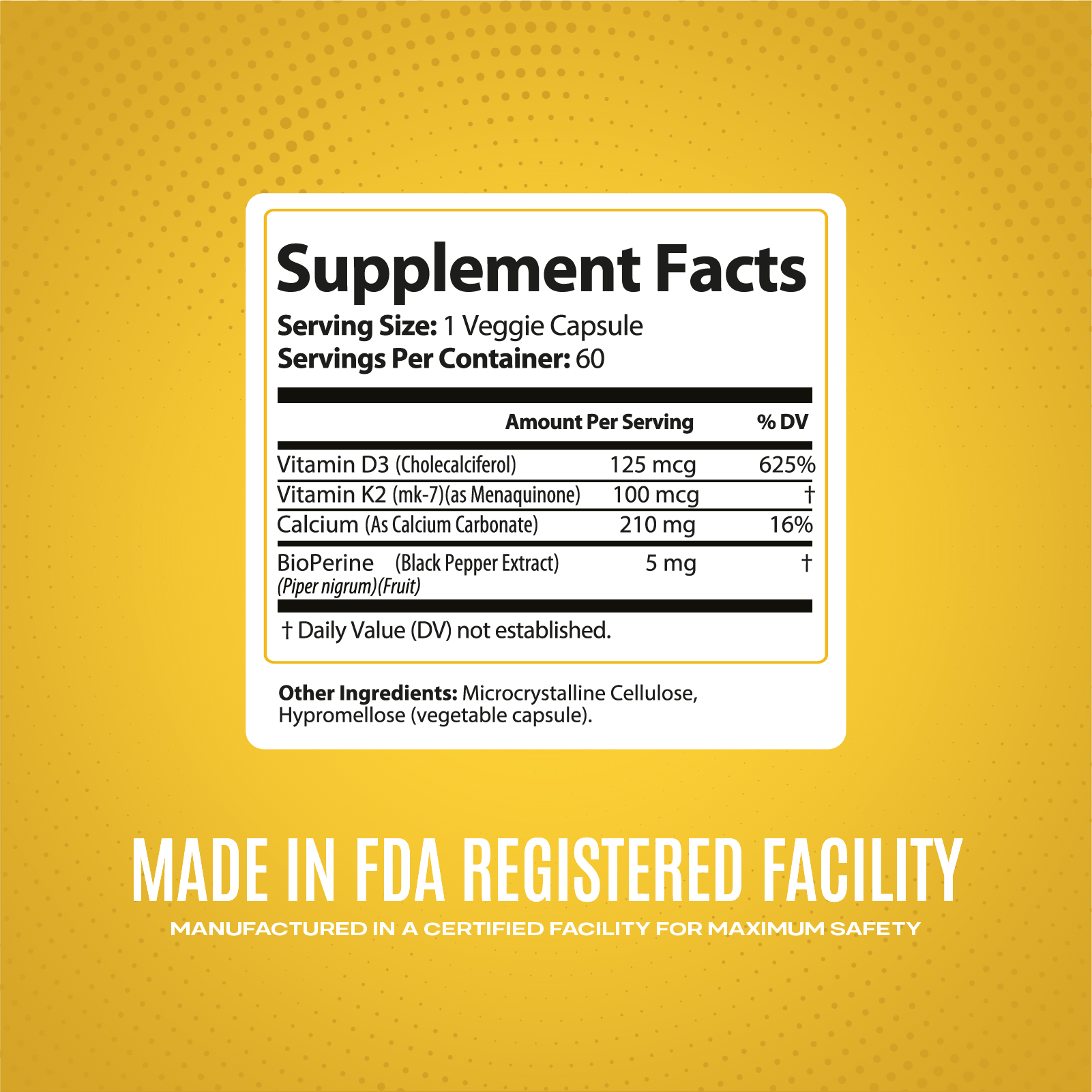 INGREDIENTS Per serving (1 capsule): Vitamin D3 (as Cholecalciferol) 125 mcg, Calcium (as Calcium Carbonate) 210 mg, Vitamin K2 (mk-7) (as Menaquinone) 100 mcg, BioPerine (Black Pepper Fruit Extract) 5 mg, Hypromellose (capsule). Other Ingredients: Cellulose (vegetable capsule).